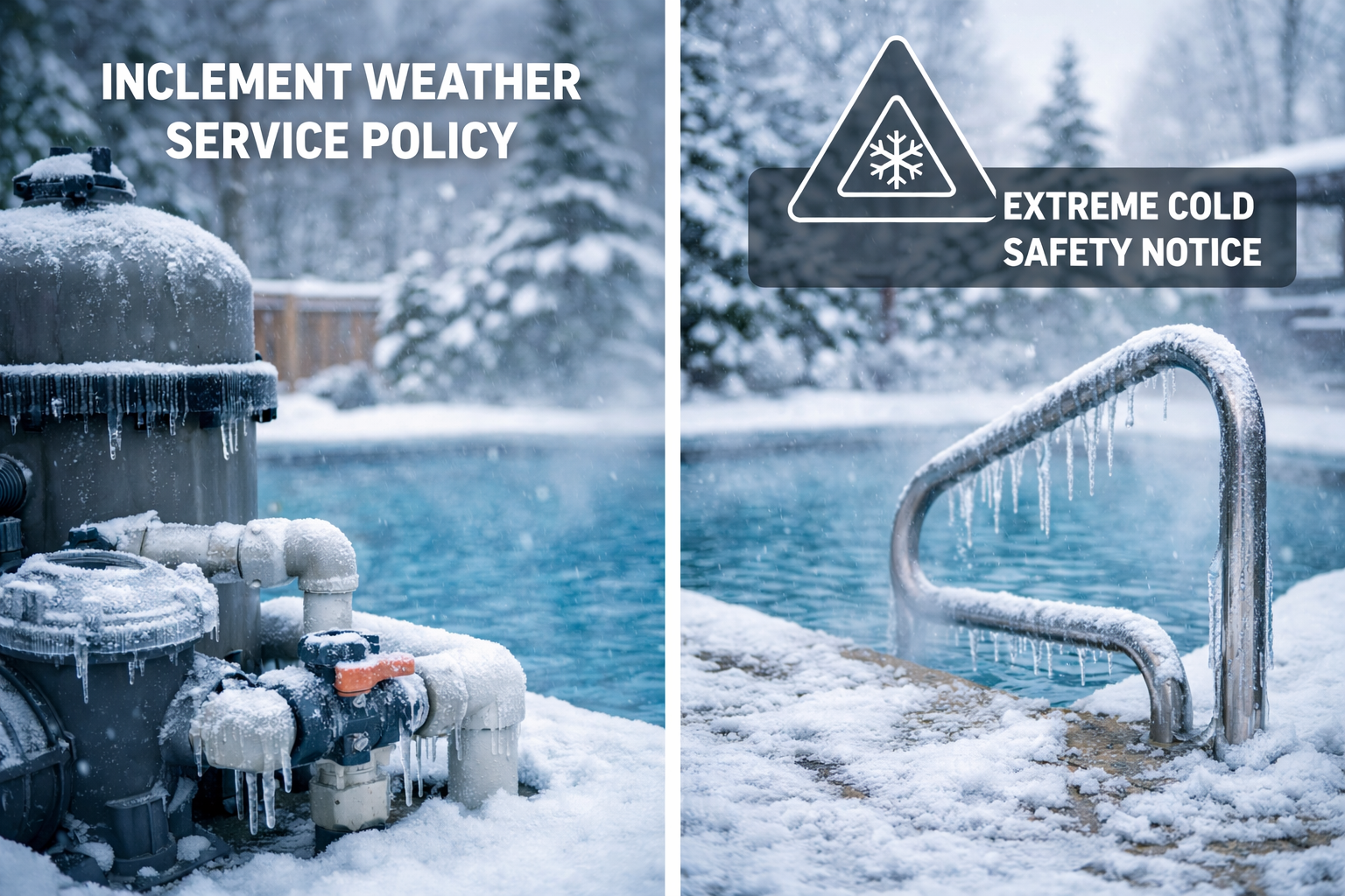 At Dragoo Services, our priority is protecting your pool equipment and preventing avoidable damage during severe weather. Certain service tasks require opening equipment (pump lids, baskets, filters, valves, and exposed plumbing). In freezing temperatures, these actions can increase the risk of cracked components, air leaks, broken seals, and equipment failure.